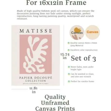 Show moreIntroducing the magnificent HesenDot Matisse Art Wall Décor Set, a stunning collection of three unframed canvas prints that encapsulate the vibrant spirit of Henri Matisse's art. Renowned for his use of bold colors and simple patterns, Matisse brings a refreshing charm to any space. This collection features exquisite representations of his iconic motifs, specifically designed to enhance the aesthetics of your kitchen, bathroom, living room, or bedroom. Each piece measures 12x16 inches, making them ideal for creating a personalized gallery wall or simply adding a splash of color to your home decor.