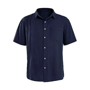 Hestenve Mens Short Sleeve Cuban Camp Guayabera Shirt Linen Cotton Hippie Beach Button Down Shirts (Large, 5-Navy)