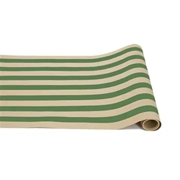 Show more Introducing the Hester & Cook Green Kraft Striped Table Runner, a beautifully designed and versatile addition to your dining and decoration essentials. Measuring an impressive 20 inches wide and 25 feet long, this disposable paper table runner is perfect for any occasion, whether it's a lively birthday party, an elegant wedding, or an inviting picnic. Crafted from high-quality materials, this stylish runner not only looks chic but is also incredibly practical. Made in the USA, it reflects a commitment to quality and sustainability, making it a proud choice for your table settings.