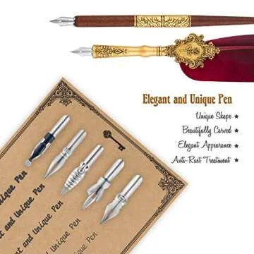 Show moreDiscover the elegance of writing with the Hethrone Feather Pen and Ink Set, the finest choice for calligraphy enthusiasts and aspiring writers alike. This meticulously crafted 22-piece accessory set brings together the classic aesthetic of feather quills with modern functionality, all beautifully packaged in a vintage-style box. Perfectly suited for anyone looking to enhance their writing experience, each feather pen is uniquely designed from natural feathers, making every set distinct and charming. With a variety of nibs included, you can easily explore different calligraphy styles while enjoying the smooth flow of ink as you create your masterpieces.