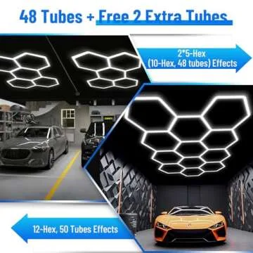 Show more This unique car detailing hexagon light system is designed to transform your garage or workspace into a vibrant, well-lit haven. With an impressive output of 110 lumens per watt, it can achieve up to 52800 lumens thanks to its total power of 480W. The light emits a natural white color temperature of 5000K, making it ideal for daylight usage, ensuring your workspace is perfectly illuminated.