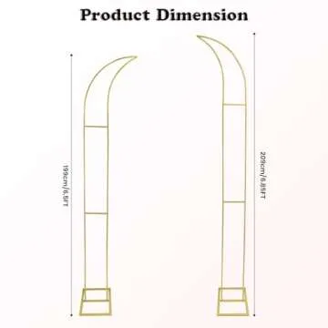 Show moreEnhance your special occasions with the stunning HeyMate Metal Arch Backdrop Stand. This exquisite set features two uniquely designed Curved Top Arches, measuring an impressive 6.85 FT and 6.5 FT, making it the perfect backdrop for weddings, baby showers, birthday parties, and more. Crafted from high-quality, corrosion-resistant cast iron, these arches are dressed in a luxurious gold coating, ensuring they not only stand out but also withstand the test of time. The lightweight yet durable design, weighing only 10.04 pounds, allows for easy decoration while providing exceptional support, eliminating any concerns about stability or safety.
