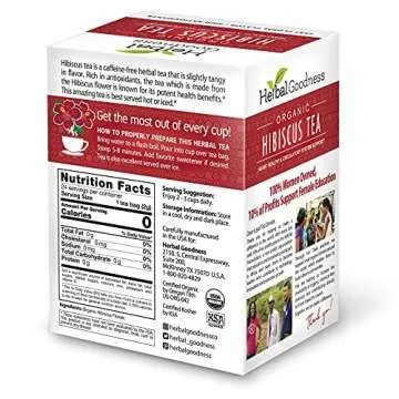 Show moreHibiscus Tea Bags offer a tantalizing blend made from handpicked organic hibiscus flowers, designed to support your overall well-being while delivering a refreshing taste experience. Not only is this unique tea known for its high antioxidant content, but it's also known to support cardiovascular health, making it a perfect choice for health-conscious individuals. With 24 premium tea bags, each individual serving packs the rich, invigorating flavor of hibiscus, ensuring that you’re sipping on a brew that’s pure, delicious, and free from synthetic pesticides and fertilizers.