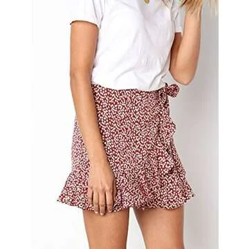 Hibluco Women's Casual Printed Asymmetrical Ruffles Tie up High Waist Short Skirt Wine Red