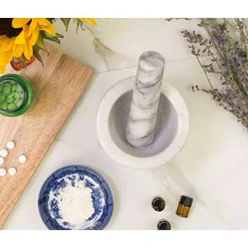 This versatile mortar and pestle set makes grinding spices, herbs, and nuts a breeze, helping you create everything from aromatic dry rubs to creamy pestos with ease. Whether you're concocting delectable sauces or preparing health-conscious remedies, it simplifies your cooking process while ensuring precision and consistency. Plus, with every set showcasing unique marble patterns, you can enjoy a personalized kitchen tool that doubles as a beautiful decorative piece.
