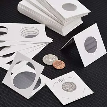 Show more Presenting the **Hicarer 300 Pieces Cardboard Coin Holder Flip Mega Assortment** – your ultimate companion for coin collection! Crafted with utmost precision, this assortment features 300 durable cardboard holders, each measuring a convenient 2 by 2 inches. Whether you're safeguarding a valuable collection or sharing your passion with the next generation, these coin holders cater to a wide range of coin sizes, from dimes to half dollars. Emphasizing quality and functionality, they are designed to keep your coins safe while allowing easy visibility and access. With robust materials, you can trust that your coins will be protected as you showcase them proudly.