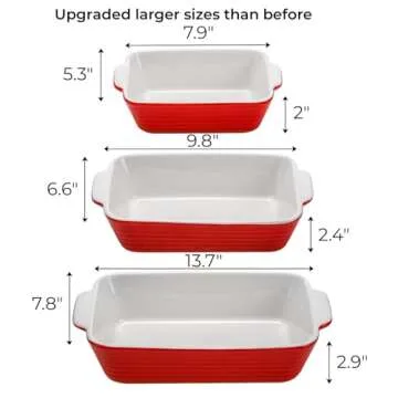 Hiceeden 3 Pack Ceramic Baking Dish Set, Square Porcelain Casserole Dish with Handle, Red, 13.7'' x 9.8'' x 7.9'', 9 in, Matte Finish, Oven & Dishwasher Safe