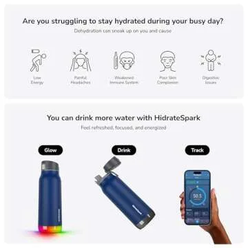 Show more The HidrateSpark PRO Smart Water Bottle revolutionizes hydration with its advanced technology and sleek design. Made from insulated stainless steel, this 32 oz bottle keeps your drinks cold for hours while offering a durable solution for on-the-go hydration. Integrated with Bluetooth technology, it effortlessly syncs with the HidrateSpark app on your smartphone to track your water intake and remind you to stay hydrated throughout the day. The captivating LED glow reminder not only serves as a stylish visual cue but also ensures you never forget to drink, promoting a healthier lifestyle.