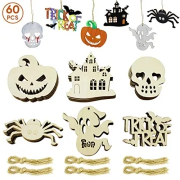 Transform your Halloween into a creative festivity with our Halloween Craft Kit, designed to spark imagination and joy in children. This kit includes 60 pieces of unfinished wooden ornaments featuring classic Halloween themes like pumpkins, ghosts, spiders, skulls, castles, and "trick or treat" signs, along with 60 pieces of twine ropes for easy hanging. Made from premium quality natural wood, each piece is laser-cut, polished, and sanded to a smooth surface, ensuring safety and durability for kids' art projects....