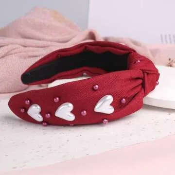 HIFANMM Valentines Day Headbands Pink Knotted Heart Hair Bands for Women Girls, Pearls Rhinestone Hearts Hair Accessories Non Slip Wide Top Knot Fashion Hair Decoration Party Supplies Hair Hoop 1Pcs