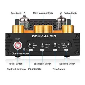 Show moreThe Douk Audio HiFi Tube Amplifier brings a new dimension to your audio experience, seamlessly blending state-of-the-art technology with a vintage aesthetic. Utilizing Bluetooth 5.0, this versatile amplifier features multiple input options including Stereo RCA, MM Phono, and a convenient 3.5mm AUX input. The innovative MM phono input converts phono signals to line level, ensuring astonishing clarity in sound output. With high-quality integrated circuits and components, every note becomes richer and more defined, manifesting a perfect harmony between modern convenience and timeless sound quality.