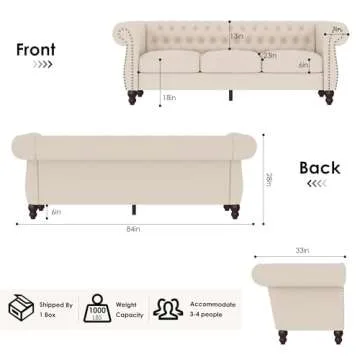 Show more Indulge in exquisite comfort and classic elegance with the HIFIT 84" Modern Couch. The perfect blend of style and functionality, this three-seater couch is designed to elevate any living space, from cozy apartments to spacious homes. With its deep 22.8" seat cushions and lovingly handcrafted button-tufted backrest, you will experience unparalleled relaxation. Its generous 6.9" rolled arms, filled with high-quality foam, support your arms while ensuring that the couch retains its shape over time. The ergonomic 105° design offers excellent support for your back, allowing you to fully stretch out and unwind after a long day.