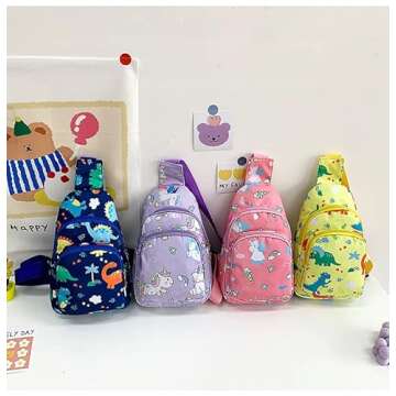 Show more Introducing the **Hiflyer Kids Crossbody Bag**—the perfect blend of fun and functionality for your little ones! This adorable sling bag is designed for kids aged 3 and up, featuring delightful cartoon motifs such as dinosaurs and unicorns that will surely capture their imagination. Crafted from high-quality, soft nylon cloth, this bag is not just cute; it's also safe, non-toxic, and odorless, making it an ideal choice for young children. The durable, lightweight material ensures that it retains its shape even after numerous adventures, whether at school, the park, or on family outings. The **mini size** of 9.4x5.9x2.8 inches makes it perfectly proportioned for little hands, allowing your child to carry their essentials comfortably without being overwhelmed.