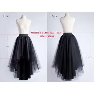 Show moreStep into elegance and whimsy with our **High Low Tulle Skirt** - the perfect companion for your most memorable events! Designed with versatility in mind, this stunning black skirt features a unique high-low silhouette, offering both style and comfort. Crafted from 100% soft and breathable polyester, this skirt ensures moisture absorption and ventilation, making it comfortable for extended wear. Thanks to its high-stretched elastic waistband, it fits a range of sizes (waist: 66cm-95cm or 25.9"-37.4") seamlessly, providing you with a flattering silhouette that complements your figure. The beautiful layering of 3 layers of opaque tulle in the front and back gives this skirt a whimsical feel, while the satin lining adds an element of luxury. Standing at 19.7" in front and 43.3" at the back, it's designed for the perfect princess look wherever you go.
