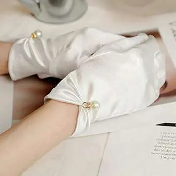 Higohome Girls' Wrist Length Wedding Gloves Satin Pearls Short Bridal Church Gloves for Bride,Ivory
