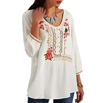 Higustar Mexican Shirts for Women Embroidered Tops Bohemian Peasant Blouse Plus Size Tunic Fiesta Cotton Clothes White