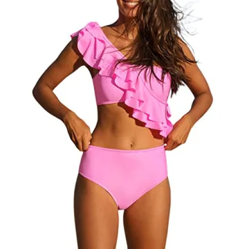 Hilinker Women's One Shoulder Ruffle High Waist Bikini Swimsuit 2 Piece Bathing Suit Hot Pink Large