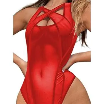 Hilinker Women's Sexy Mesh Sheer Sleeveless Bodysuit - Red Medium