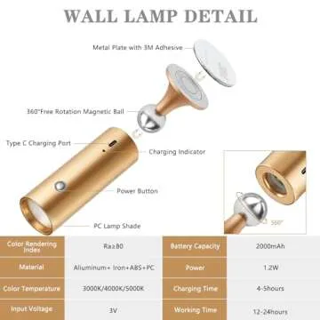 Hillsboro Wall Sconces Set of Two Battery Operated, 3 Colors Dimmable Battery Powered Wall Sconce,Brushed Gold Magnetic Wall Light, Portable Wall Light for Bedroom, Peel and Stick Sconce Lights