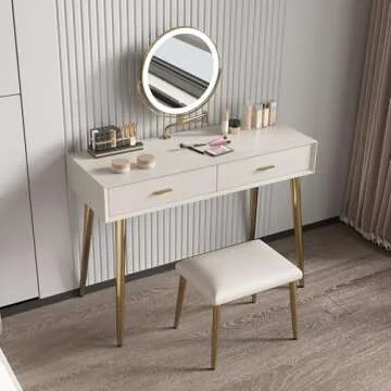 Construction quality is also top-notch; crafted from high-quality materials including a solid wood frame and stainless-steel gold-plated legs, this vanity guarantees stability and durability for long-term use. The square stool, upholstered in high-elastic sponge and soft PU, provides comfort during extended usage, ensuring you'll never tire while getting ready.