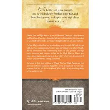 Show moreDiscover the profound spiritual journey depicted in Hannah Hurnard's illuminating narrative, Hinds' Feet on High Places. This award-winning book, published by Tyndale Momentum, takes readers through the trials and tribulations faced by its protagonist, Much-Afraid. As she traverses the challenging paths leading to the 'High Places', Much-Afraid embodies the struggles of faith, hope, and perseverance. With a captivating blend of allegory and deep Christian insight, this mass-market paperback enriches its readers with lessons of trust in God's promises.