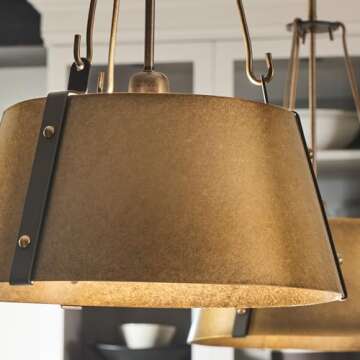 Show more Introducing the Hinkley Cartwright Small Single Light Drum Pendant, where modern design meets industrial charm. This eye-catching fixture boasts a Rustic Brass shade that is artistically enhanced by bold rivets, skillfully paired with Oil Rubbed Bronze straps. Not only does this pendant light deliver on style, but its adjustable height feature ensures it fits perfectly in any space, whether you're illuminating a cozy nook or making a statement in a dining area.