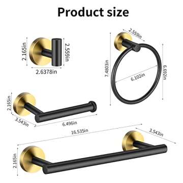 Show more Transform your bathroom with the elegant Hinmood Bathroom Hardware Set, a comprehensive collection designed to blend style with functionality. This stunning set includes a 16-inch hand towel bar, a 6.3-inch toilet paper holder, two towel hooks, and a towel ring—covering all your essential bathroom needs. Each piece showcases a sleek design, making it perfect for various decor themes, from modern to classic.