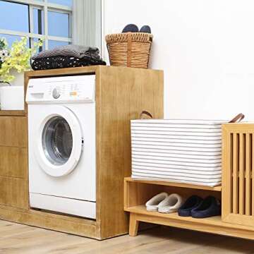 Its stylish and simple design seamlessly integrates with any home décor, making it more than just a storage solution; it’s also a beautiful decorative element. The convenience it provides is highlighted by the practical features such as easy-to-hold leather handles and a dust-resistant drawstring top that help maintain a tidy ambiance.