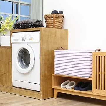 Hinwo 70L Extra Large Storage Bins, Closet Organizers and Storage, Foldable Clothes Storage Baskets with Handles, Containers for Clothing, Blanket, Comforters, Toys, Bedding (Purple Stripe)