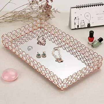 Hipiwe Crystal Cosmetic Makeup Tray - Large Mirrored Vanity Tray Jewelry Trinket Organizer TrayTray Home Decorative Dresser Tray Bathroom Tray, Rosy Gold