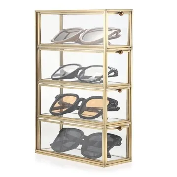 Hipiwe Elegant Sunglasses Organizer Box - 4 Drawers, Clear Glass & Gold Metal