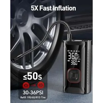 Show more The powerful Smart Air Compressor is the ultimate accessory for anyone who values efficiency and convenience in their travels. With a remarkable ability to inflate tires up to 5X faster than standard pumps, it is designed to cover a wide range of inflation needs with ease. Priced competitively yet packed with unique features, this compressor is a must-have for every vehicle owner. Imagine boosting your car tire pressure from 30 to 35 PSI in just 50 seconds! It can fully inflate tires from 0 to 36 PSI in a mere 5 minutes, making it incredibly efficient for cars, bicycles, and motorcycles alike.
