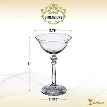 These coupe glasses are not just a visual treat but also offer convenient durability. They are dishwasher safe, designed for hassle-free cleaning, and optimized for both aesthetics and functionality. Their dimensions—Top Diameter: 3 3/4 inches; Base Diameter: 2 7/8 inches; Height: 6 inches; Volume Capacity: 4 3/4 ounces—make them a perfect fit for any cocktail recipe.