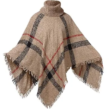HITOP Women's Dress Ponchos - Boho Loose Tassel Plaid Turtleneck Knit Sweater