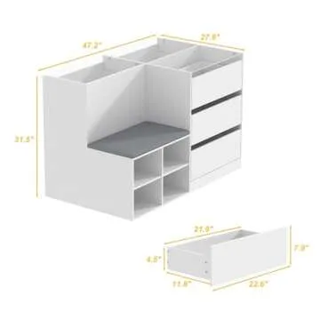 Show more Discover the perfect blend of style, functionality, and organization with the Hitow Display Cabinet Island. Designed for modern living, this multifunctional walk-in closet organizer is not only a storage solution but a statement piece that enhances the aesthetic appeal of your home. Measuring 27.6"D x 47.2"W x 31.5"H, it efficiently utilizes your space with its generous storage capabilities. The cabinet features a cushioned shoe bench, making it a comfortable spot to sit and put on your favorite pairs. The combination of shelves and nine deep drawers makes it ideal for storing everything from perfumes and belts to watches and accessories, keeping your bedroom clutter-free.
