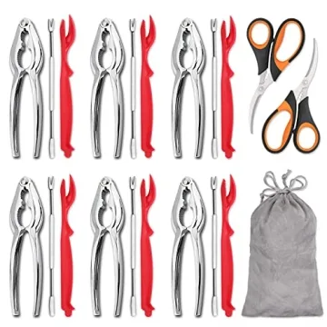Introducing the Hiware 20-Piece Seafood Tools Set, an essential collection for seafood enthusiasts that transforms every shellfish feast into an unforgettable dining experience. This premium ensemble includes 6 durable zinc alloy crab crackers, 6 food-grade plastic lobster shellers, 6 stainless steel crab leg forks or picks, 2 high-grade stainless steel seafood scissors, and a convenient cotton storage case....