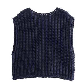 Hixiaohe Womens Crochet Chunky Knit Top Sleeveless Button Down Crop Tops Trendy Cardigan Sweater Vest for Women with Pockets(Navy,L)