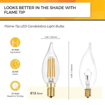 Hizashi 90+ CRI LED Candelabra Bulb 40W Equivalent E12 LED Bulb Dimmable 2700K Soft Warm White, Chandelier Light Bulbs, 4W 450LM Flame Tip CA10 Candle Light Bulbs, UL Listed - 12 Pack