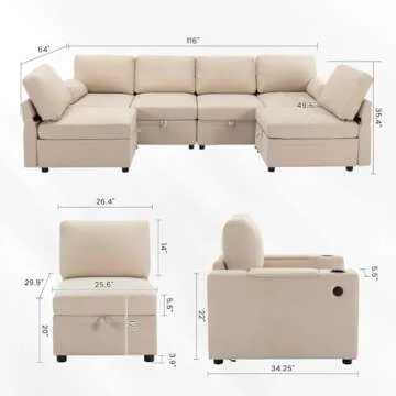 HJco Modular Sectional Sofa with Ottomans, Convertible U Shaped Sofa Couch with Storage, USB Port & Cup Holders, Beige Memory Foam 6 Seats Sofa Couch with Reversible Chaise for Home, Living Room