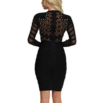 HLBandage Long Sleeve Mesh Beaded Knee Length Rayon Bandage Dress (L, Black)