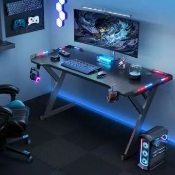 HLDIRECT 40 INCH Gaming Desk with LED Lights, Home Office Gamer Desk, Ergonomic Computer Table with Large Carbon Fiber Desktop, Office Workstation, Cup Holder & Headphone Hook, Black