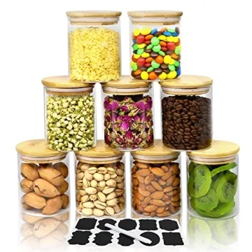 Show moreIntroducing the exquisite Hoanra 15oz Glass Jars with Airtight Bamboo Lids, a must-have for every kitchen enthusiast and organization lover. This 9-piece set is expertly crafted from high-strength borosilicate glass, ensuring durability and a sleek appearance that complements any kitchen decor. Each jar stands at a height of 4 inches and boasts a wide diameter of 3.35 inches, offering a generous capacity of 15oz (450ml) to comfortably store a variety of ingredients, from spices and teas to candies and nuts. To enhance your storage experience, we include 10 labels and a white marker, allowing you to maintain an organized pantry effortlessly.