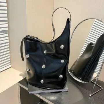 Show moreIntroducing the Hobo Bags for Women Studded Purse, a perfect blend of retro charm and contemporary flair that is not only stylish but also incredibly functional. Crafted from high-quality PU leather and reinforced with durable polyester, this tote promises longevity while ensuring utmost comfort during use. With dimensions of 11.02 inches (L) x 6.69 inches (W) x 11.02 inches (H), this large commuter bag is spacious enough to house your daily essentials, including your smartphone, lipsticks, cosmetics, and any other must-haves. The chic studded design paired with a magnetic buckle closure elevates its sophisticated aesthetic while ensuring practicality and accessibility. This versatile bag is suitable for anyone wanting to make a statement and complete their outfit with a trendy accessory.