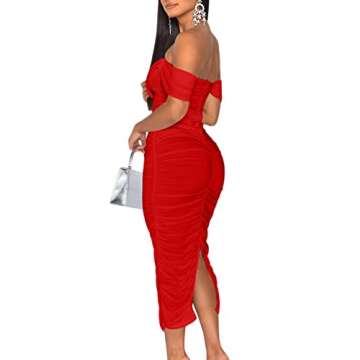 Show moreThe HOCILLE Women’s Sexy Ruched Bodycon Strapless Off Shoulder Midi Club Party Dress is a stunning addition to any wardrobe, designed specifically for the modern woman who loves to make a statement. Tailored from high-stretch fabric, this dress ensures a soft touch and magnificent comfort, allowing you to dance all night without feeling restricted. Its eye-catching ruched design along the sides and back not only flatters your curves but also brings an element of elegance to the classic tube dress. With its back split and backless details, this versatile dress perfectly embraces your silhouette, making it a must-have for any occasion.