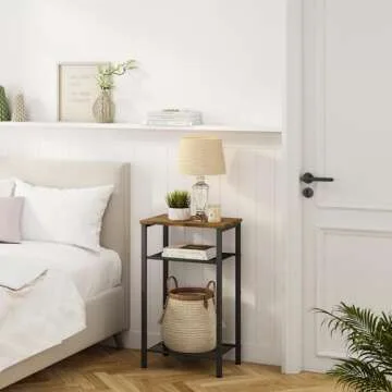 Show more The perfect blend of functionality and style, this vintage wooden end table is not just a piece of furniture, but a versatile addition to your home. Designed with practicality in mind, this table can serve multiple purposes, whether it’s as a quaint side table for your sofa or a nightstand for your bedroom. With its warm rustic brown finish and sturdy structure, it enhances the charm of any decor while providing essential storage space. Made from FSC-Certified wood and a rust-proof square tube frame, this table is built to last, supporting heavier items without wobbling. You’ll find it’s about more than just looks; the 3-tier design consists of open shelves that offer ample space for displaying your treasured books, stylish lamps, or decorative items, ensuring that everything you need is within arm’s reach.