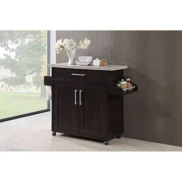 Show moreIntroducing a stunning solution for all your kitchen organization needs that adds both style and functionality to your space! This versatile kitchen island offers ample cabinet space to store small appliances, pots, pans, and much more. With a dedicated drawer for your utensils and dinnerware, it provides a convenient and accessible way to display your microwave, toaster, and other small appliances. The island features wheels that facilitate easy movement around your kitchen, along with locking casters to keep it firmly in place when needed. Additionally, you'll find a spice rack and towel holder to enhance your cooking experience.