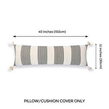 Show moreIntroducing the Hofdeco Modern Boho Moroccan Indoor Outdoor Body Lumbar Pillow Cover, a stylish and practical addition to your home decor. Measuring 12"x40" (30x102cm) and featuring a timeless black and white stripe pattern, this pillow cover is designed to elevate any space. Its playful tassels on the corners add an eye-catching touch, ensuring it stands out whether placed indoors or outdoors. Crafted from weather-resistant polyester, this cover promises durability and style, making it the ideal choice for any season.
