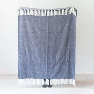 Hofdeco Modern Herringbone Stripes Decorative Knitted Throw Blanket with Fringe for Couch Sofa, 50" x 60", Navy Blue