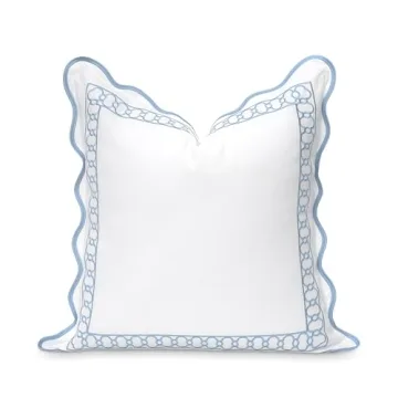 Show more Introducing the Hofdeco Premium Coastal Patio Indoor Outdoor Scalloped Throw Pillow Cover, a stunning addition that beautifully marries style and functionality. Measuring a generous 20"x20" (50x50cm), this exquisite pillow cover showcases a charming baby blue begonia embroidery on a crisp bright white background, elegantly framed by a scalloped edge. Designed to be highly versatile, it reverses to a solid white, providing a chic and polished look that can seamlessly elevate any space, whether indoors or outdoors.