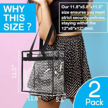 Introducing the Hoiny Clear Bag for Stadium Events, the ultimate companion for sports events, concerts, and more. This set of two large transparent tote bags has dimensions of 11.8x5.8x11.5 inches, perfectly adhering to strict security policies (max size 12x6x12 inches). Designed with portability and practicality in mind, these bags let you breeze through venue entrances while carrying all your essentials with style.